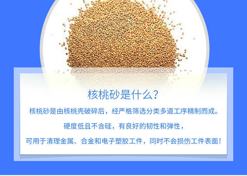 2、核桃砂由核桃殼破碎后,經(jīng)嚴格篩選分類多道工序精制而成。其型狀顆粒均達到國際工業(yè)標準,核桃砂應用于電子產(chǎn)品上后續(xù)拋光去除多余膠類;橡膠、塑膠!因其有良好的韌性和彈性,也可用于清理金屬、合金和電子塑膠工件,不會損傷工件表面!核桃砂用于噴砂清理行業(yè),如有噴漆、銹跡、化學物資等存在的工件表面,有去除殘存物和表面光潔的作用!